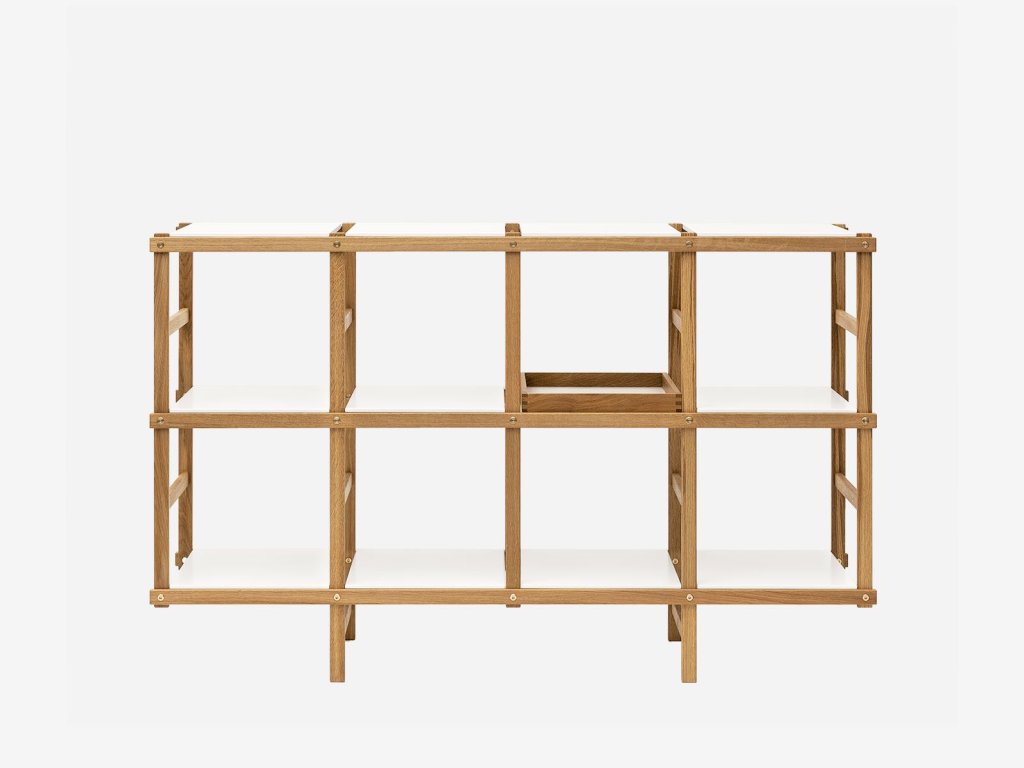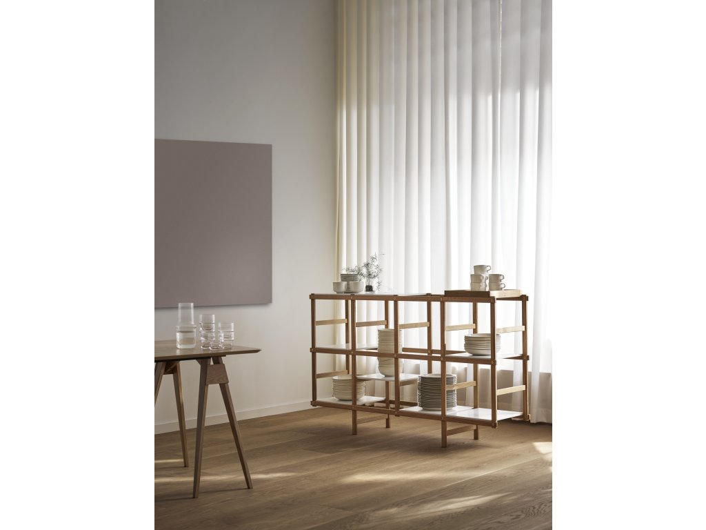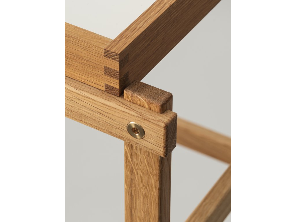 Vyroben z profilovaných tyčí, které do sebe zapadají, Frame působí lehce, ale je mimořádně pevný. A samozřejmě – ryze skandinávský, celý ze dřeva s důrazem na detail spojů. S jemným překvapením navíc: odhalené mosazné závitové matice zachycují světlo a zdůrazňují čitelnost celé konstrukce.