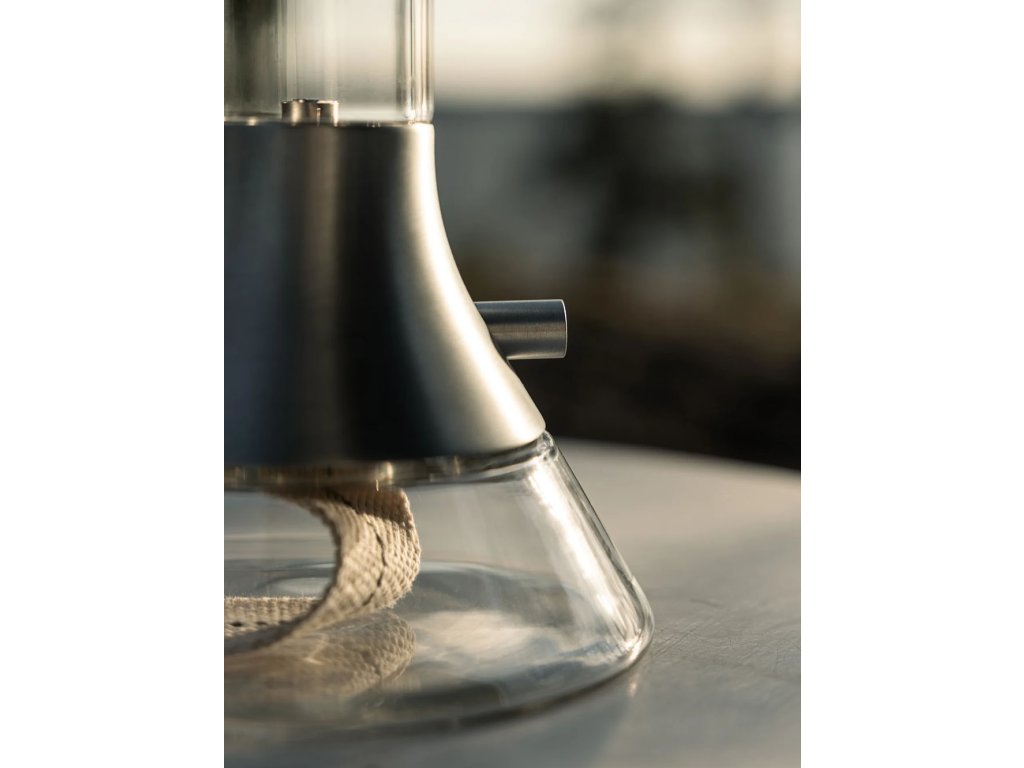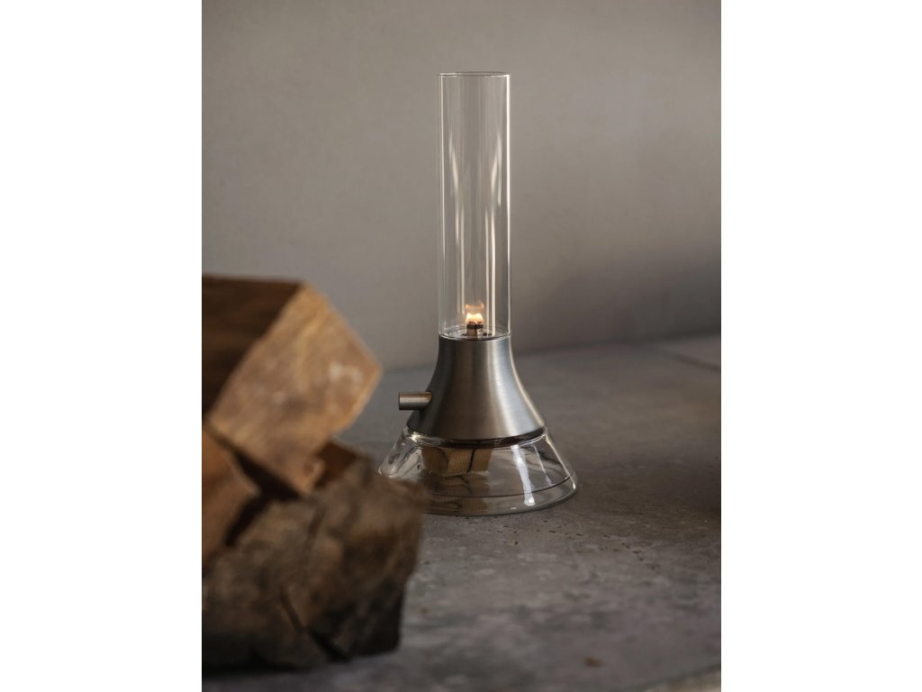 Fyr spojuje výraznou kuželovou základnu, robustní krček pro knot a válcovitý skleněný komín pro plamen. Pomocí pevného, ale elegantního ovládacího kolečka lze snadno regulovat velikost plamene i naklonit lampu při přenášení. Průhledná skleněná základna umožňuje kontrolu množství oleje i pohybu knotu při nastavování.