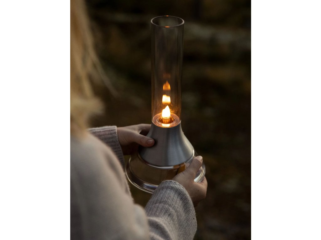 Fyr Kerosene Lamp poskytne příjemné a přesto výrazné světlo v interiéru, a skvěle poslouží i venku – pokud ji umístíte mimo přímý vítr. Široká kuželová základna o průměru 16 cm zajišťuje stabilitu na jakémkoli povrchu. Výška lampy přesahuje 30 cm, což jí dodává impozantní přítomnost.