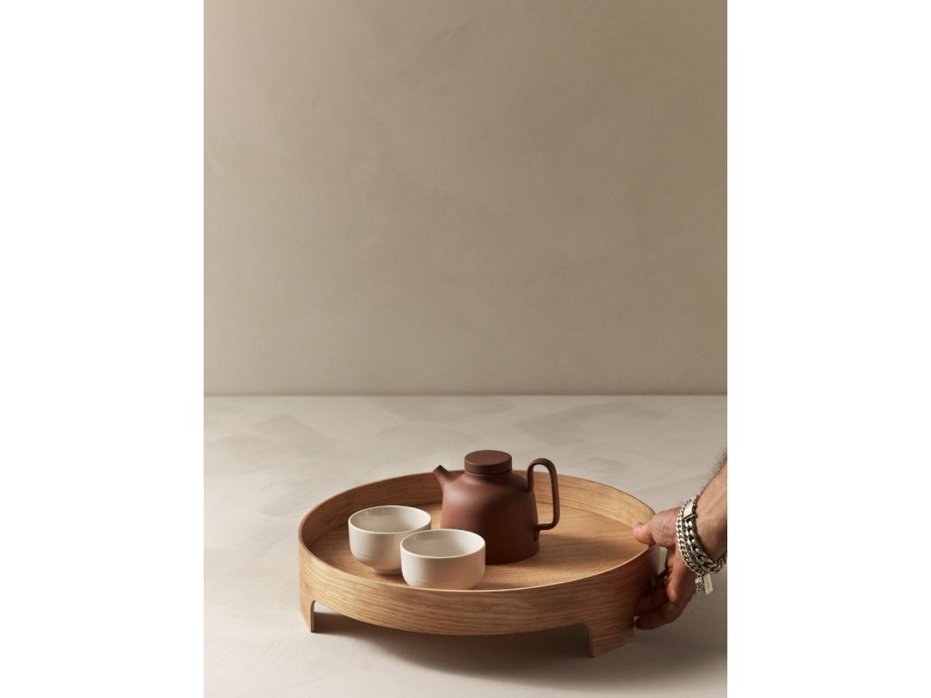 „Často pracuji vsedě na zemi,“ vysvětluje Carina Seth Andersson. „Nechci riskovat, že něco vyliju při zvedání tácu z rohu místnosti nebo zakopnu o jeho madla. Bridge Tray je lehce vyvýšený nad podlahou a snadno se uchopí za štěrbiny v okraji.“ Ráda jej používá i na velkých stolech, kde ho jednoduše přesune tam, kde je právě potřeba. Její design je vizuálně výraznou odpovědí na typologické výzvy moderních, neustále se proměňujících prostor – ať už v domácnosti, nebo na veřejnosti.