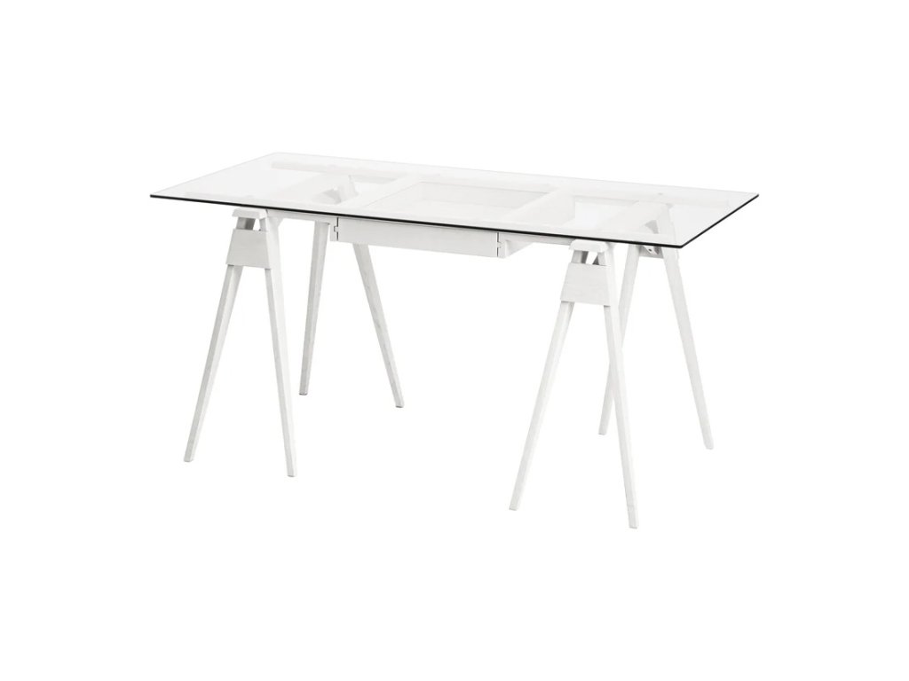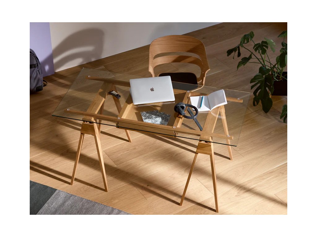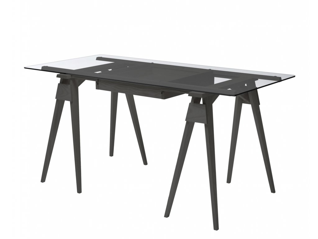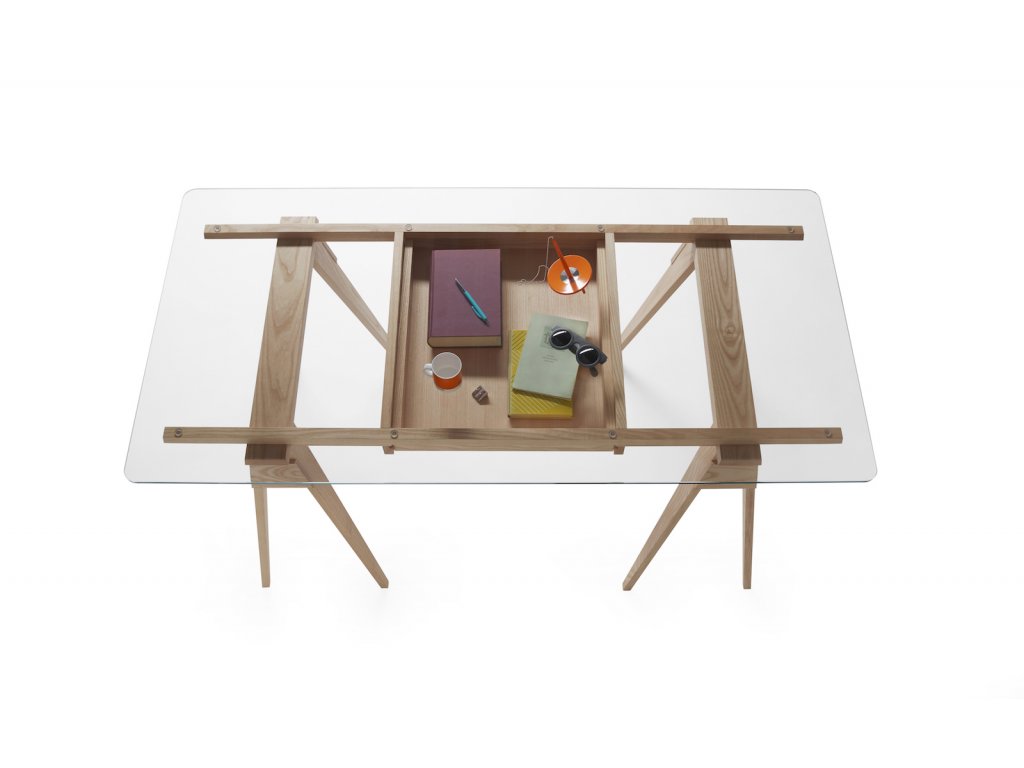 Skleněná pracovní deska odhaluje všechny krásné věci, které by jinak zůstaly skryté v zásuvce. Ačkoliv konstrukce působí jednoduše, Arco ukrývá řadu promyšlených detailů: rám je ke kozám pevně připevněn pomocí dřevěných kolíků pro zajištění stability. Zásuvka je přístupná z obou stran stolu a tvrzená skleněná deska má hladce zaoblené hrany, které snižují riziko poranění. Deska spočívá na malých plastových podložkách, které zajišťují její pevné a stabilní usazení.