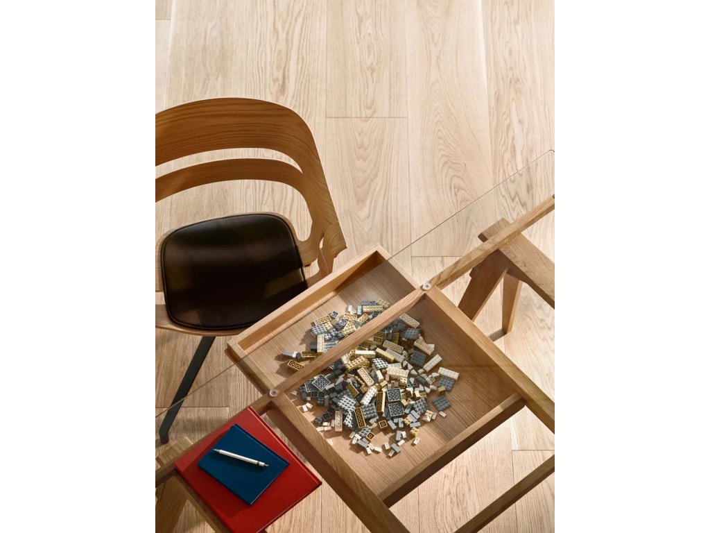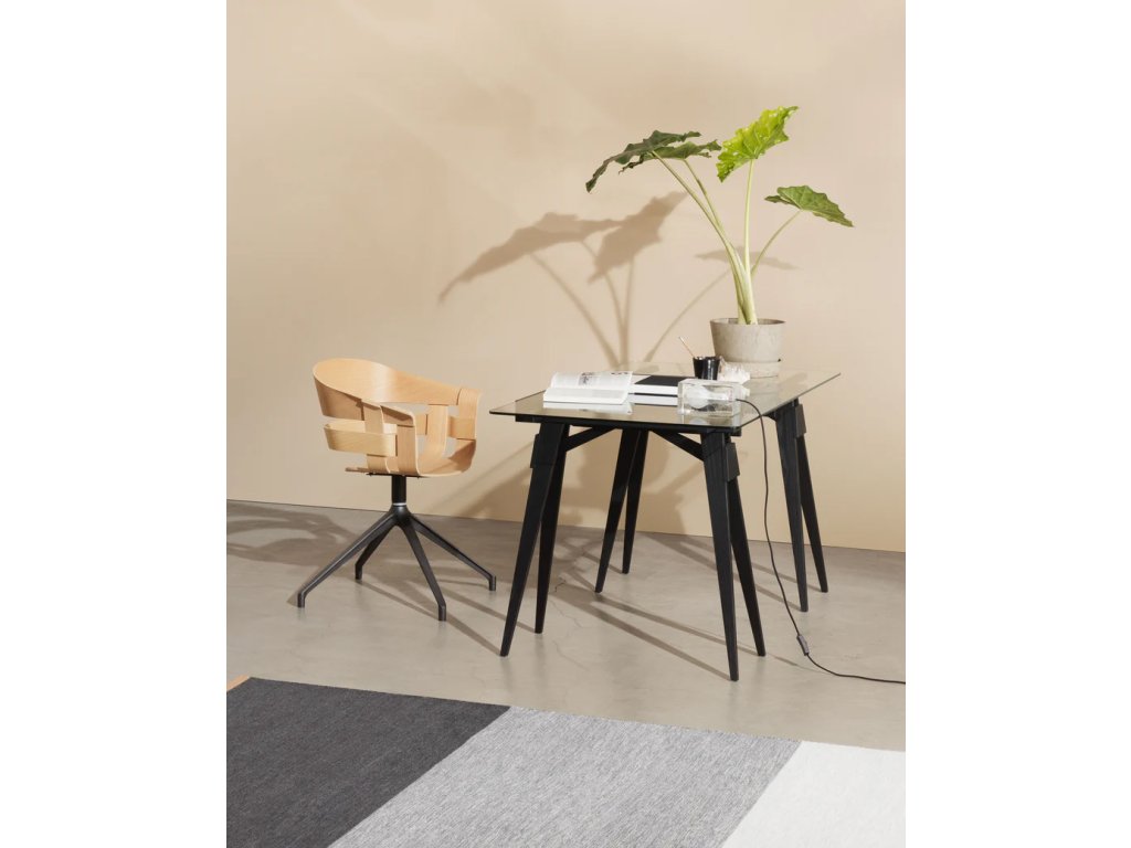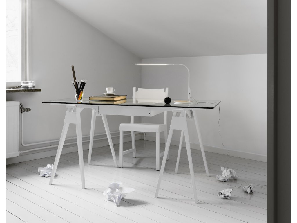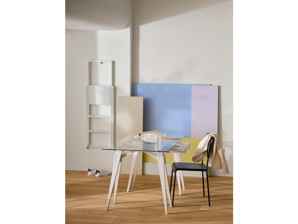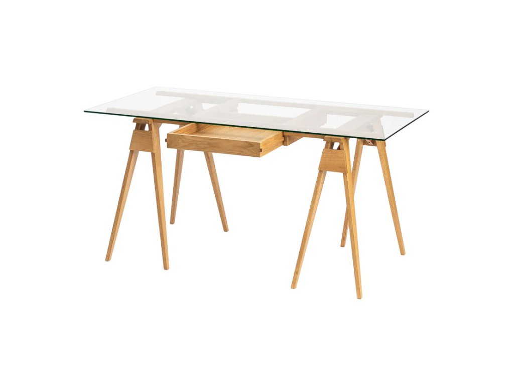 Skleněná pracovní deska odhaluje všechny krásné věci, které by jinak zůstaly skryté v zásuvce. Ačkoliv konstrukce působí jednoduše, Arco ukrývá řadu promyšlených detailů: rám je ke kozám pevně připevněn pomocí dřevěných kolíků pro zajištění stability. Zásuvka je přístupná z obou stran stolu a tvrzená skleněná deska má hladce zaoblené hrany, které snižují riziko poranění. Deska spočívá na malých plastových podložkách, které zajišťují její pevné a stabilní usazení.