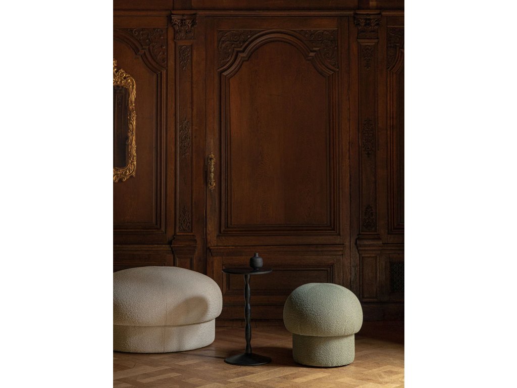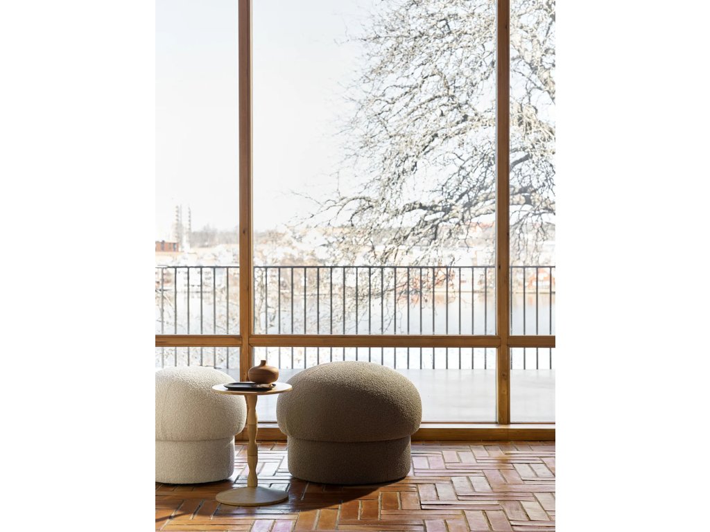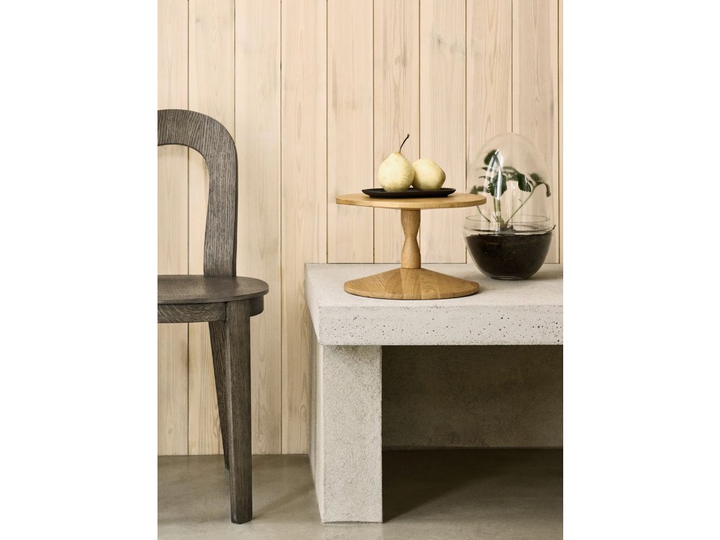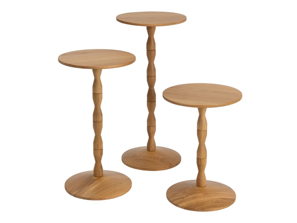 Stolek žPedestal má ale i funkční „twist“ – díky pěti mezikusům z poctivého masivního dubu lze snadno nastavit výšku v rozmezí od 25 do 55 cm, a to bez volných dílů. Spojovací šrouby a matice jsou plnohodnotnou součástí designu a přispívají k jeho čistému, technickému výrazu. Stabilitu zajišťuje těžký železný prstenec diskrétně ukrytý v podstavci. Díky pevnému, ale přesto elegantně štíhlému provedení je stůl snadno přemístitelný a přitom mimořádně stabilní.