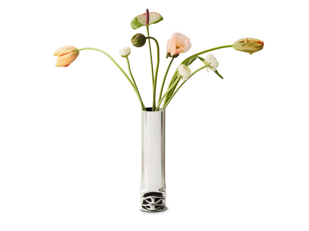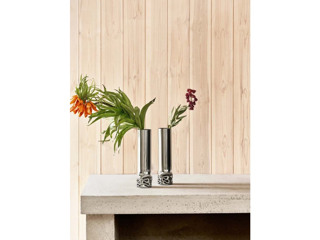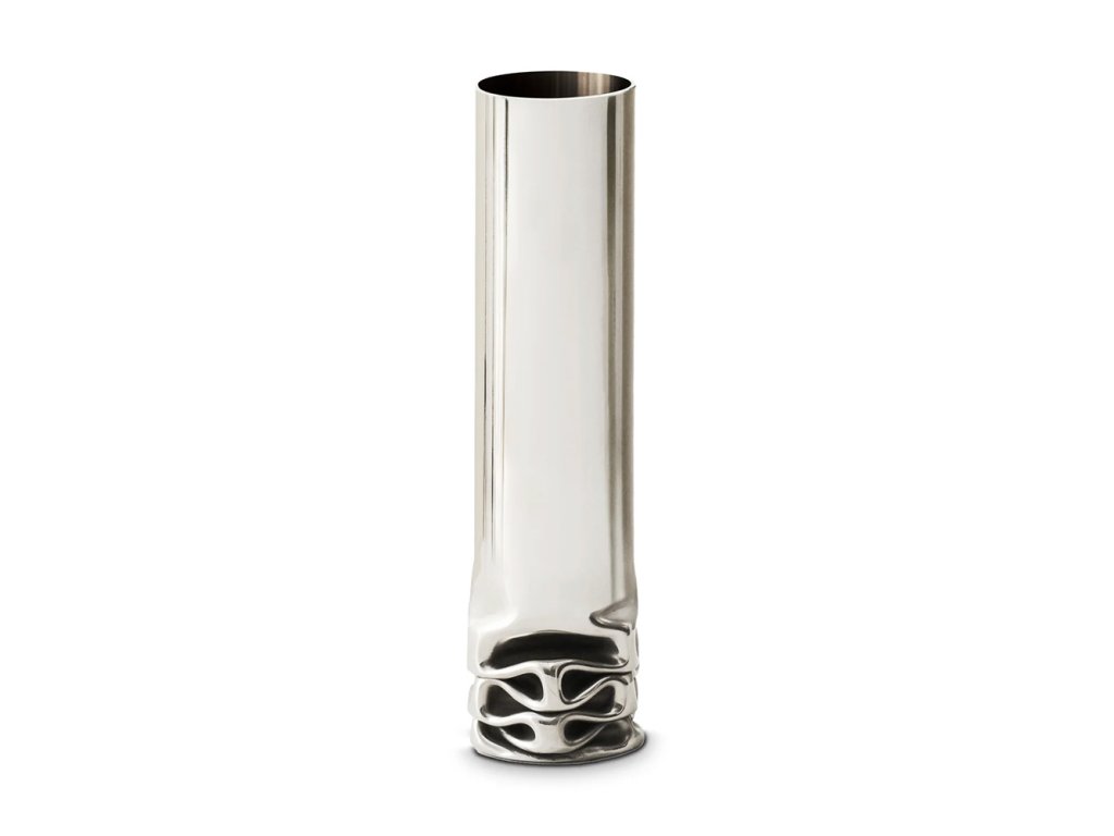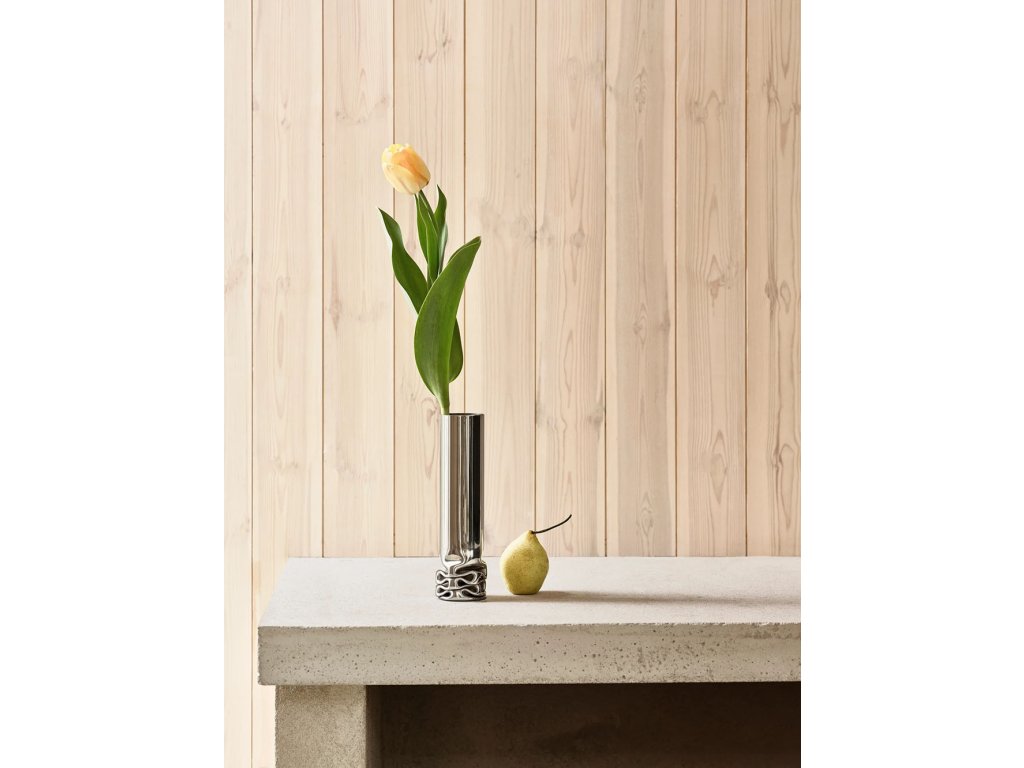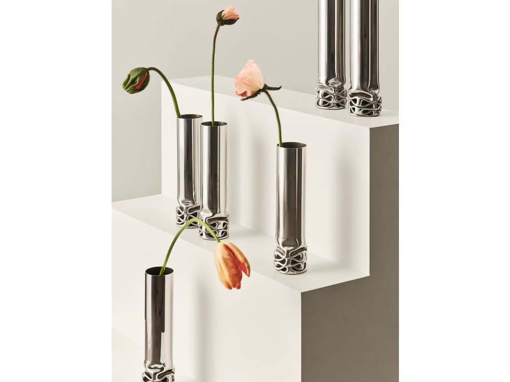Váza Hydraulic je výsledkem tohoto tvůrčího hledání – dokonalá symbióza funkce a umění. Každý kus vzniká složitým procesem a je naprosto jedinečný – žádné dvě vázy nejsou stejné. Válcová forma z nerezové oceli, zploštělá v základně, nese stopy obrovského tlaku, který byl při výrobě použit – a přesto působí lehce, téměř organicky. Výsledkem je objekt, který v sobě spojuje sílu i jemnost, surovost i smyslnost – vše z jediného materiálu.